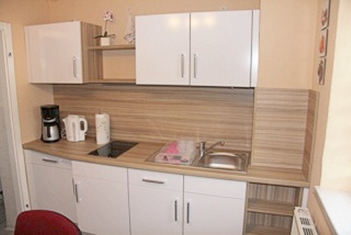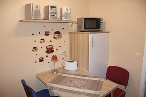 Der Wohnraum ist ausgestattet mit einer Sitzecke zum Lesen oder Fernsehen. Eine SAT-TV-Anlage bietet eine Vielzahl von Fernsehprogrammen. Desweiteren ist eine Radioanlage mit CD-Player vorhanden. Die Küche ist mit allem Notwendigen ausgerüstet (Wasserkocher, Mikrowelle, Kaffemaschine, Kühlschrank mit Gefrierfach, u.s.w.). Zwei Kochplatten ermöglichen die Zubereitung kleiner Mahlzeiten.