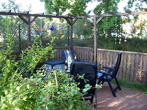 Auf der kleinen Terasse befinden sich Gartenstühle mit entsprechenden Sitzpolstern, die zum Ausruhen in der Sonne einladen, sogar ein kleiner Gartengrill ist vorhanden.