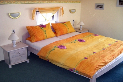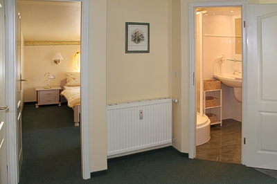 gehört ein Schlafzimmer mit Doppelbett. Das Bad ist ausgestattet mit