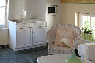 Die Miniküche ist komplett ausgestattet mit Kaffeemaschine, Toaster,